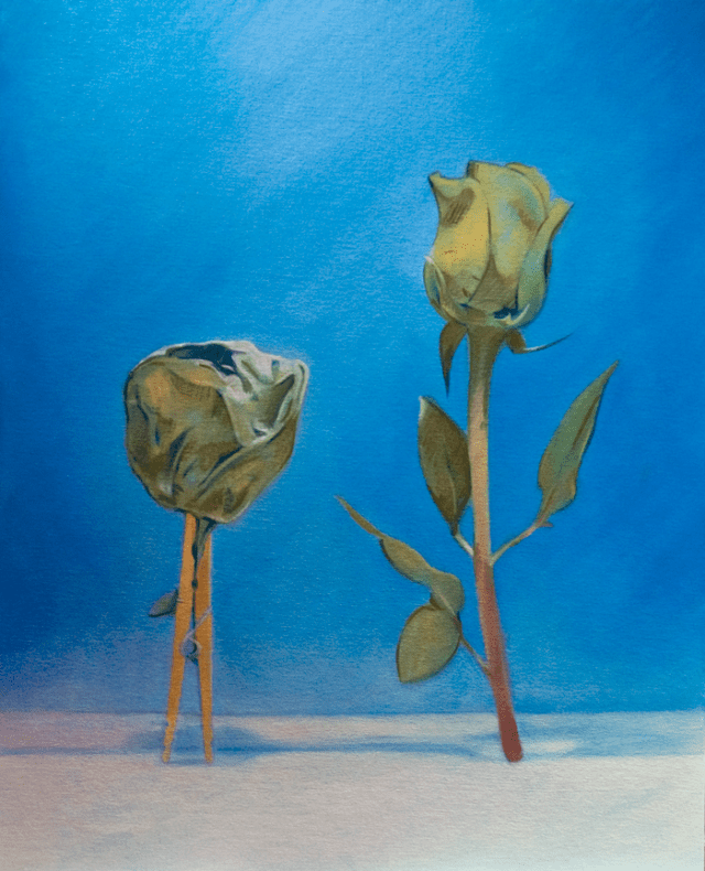 Then I mixed up some oxide green and naples yellow to work on the rose and clothespin. I worked monochromatically, building up tones and contrasts.