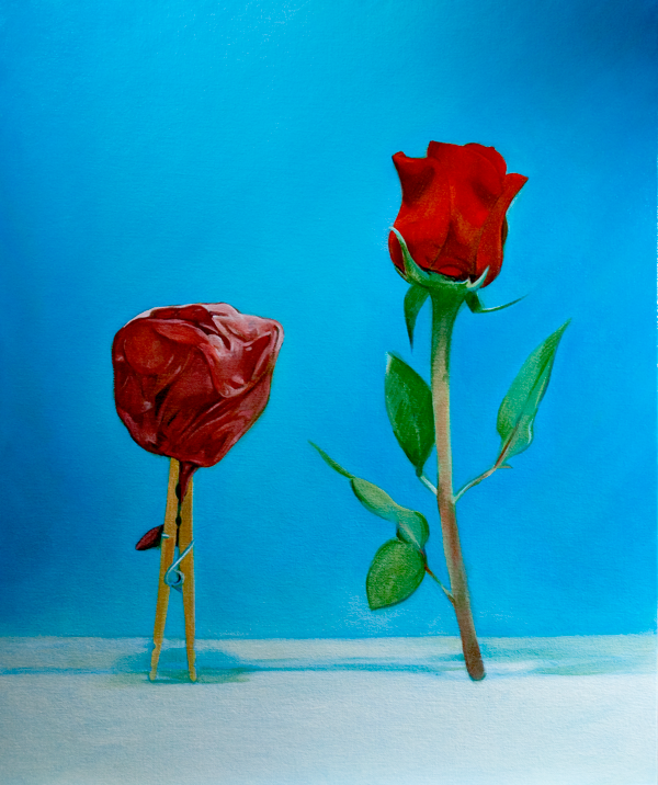 The foreground needs more work as well. The way I set up the objects for my photo source resulted in some unique challenges. It’s not apparent in the painting (so far), but the rose and clothespin are leaning against a pane of glass, and the glass is leaning against blue paper. I stumbled on this while playing round with the composition. It resulted in the appearance of the objects standing on their own. The side effect is the line of the glass (near the stem and bottom of pin), and the odd shadow glaze that the glass casts between its edge and the blue paper.