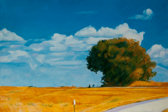 This painting captures the playground in the park at dusk. It’s a different approach for me; I don’t think I’ve ever tried to paint something in deep shadows and twilight before. It’s sort of like painting with colored mud. For me, the shadow area is turning into a place I can play with cubist motifs; using different shades of dark to push/pull the space.