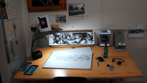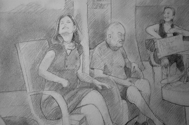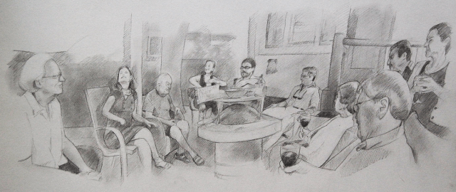I’ve been working on this drawing for the last 2 weeks. I began by making a series of snaps with my phone, panning from left to right as I shot. I did this a few times. Then I assembled the photos to create a panorama montage of the scene, altering both space and time in the process. Even tho this is a fairly accurate representation of Steph & Greg’s backyard, I’ve compressed and expanded space as the composition needed. And even tho all the figures are reacting to the same event, I’ve combined reactions over a time span and put them together as if they all exist in the same moment.