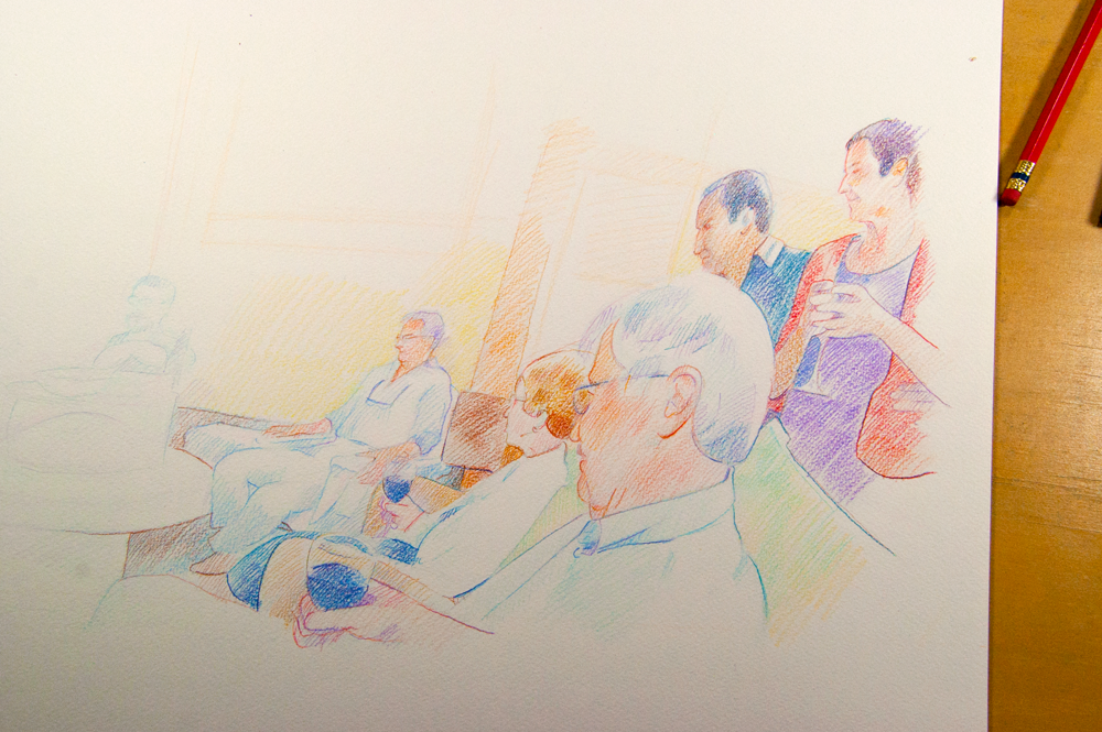 I was having trouble getting the results I wanted using color pencils. Even using Prismacolors, the colors just didn’t pop. I remembered I had a box of watercolors and gouache in my studio. I used to do a lot of watercolor work, but had not thought much about it lately. It struck me that using gouache (opaque watercolor) with the color pencil might work.
