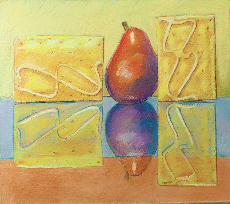 I’ve been away from studio work for a while due to other concerns. I went today, and decided to revisit this pastel that I had previously thought of as just about finished. It looked a bit washed out to me, so I started adding colors, particularly yellows on the tarts, reds, orange and purple on the pear.