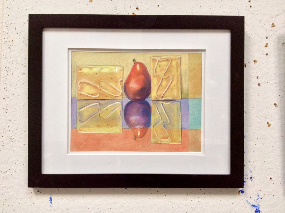 This pastel has been sitting, taped to a board, on an easel, for over a month. I had altered course on this composition shortly after starting, thinking the tarts and pear were pushed to far to the left. I taped over about 1.4 inches on the right to try to balance. I intended to mat and frame so the taped over parts would not be noticed.