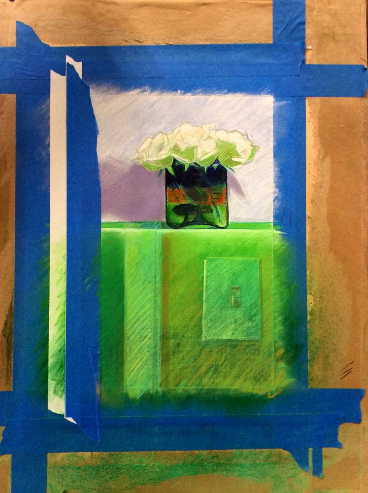 For the The Locomotion, I had taped off the right side to balance the composition, intending to frame and mat to cover the taped area. When I removed the tape, I like the effect of the early stage of the pastel showing next to the more developed section to the left, so I set out to consciously produce it. The strips of tape on the left side are covering various layers of the composition. In a work session or 2, I will add tape and/or remove tape and finalize.