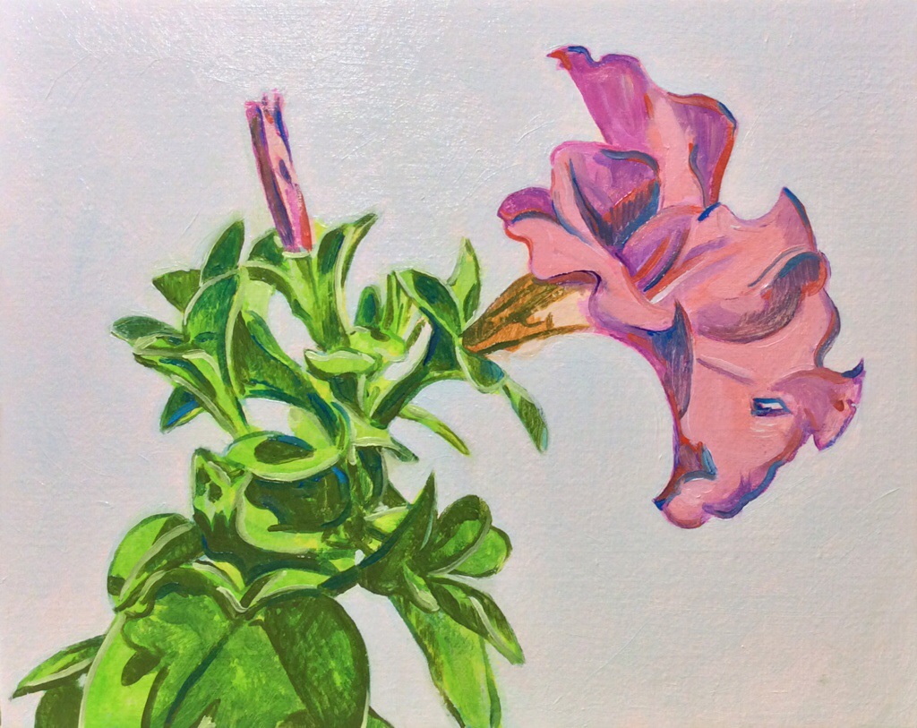 It’s a petunia growing in my yard. When photographing for this painting, I put a blank sketchbook page behind it to focus on flower with no background.