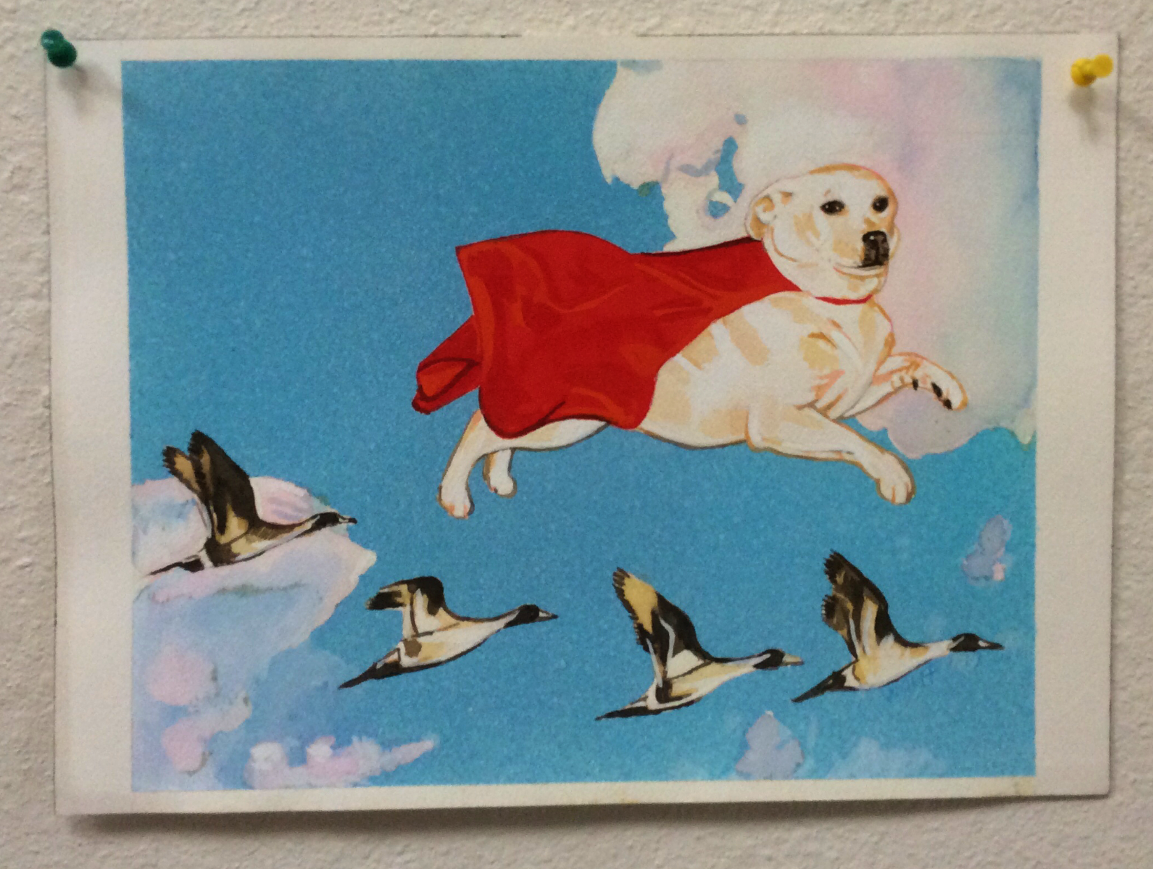 While cleaning, I came across this old watercolor or our beloved Cosmo, cast as Krypto, the DC super dog.