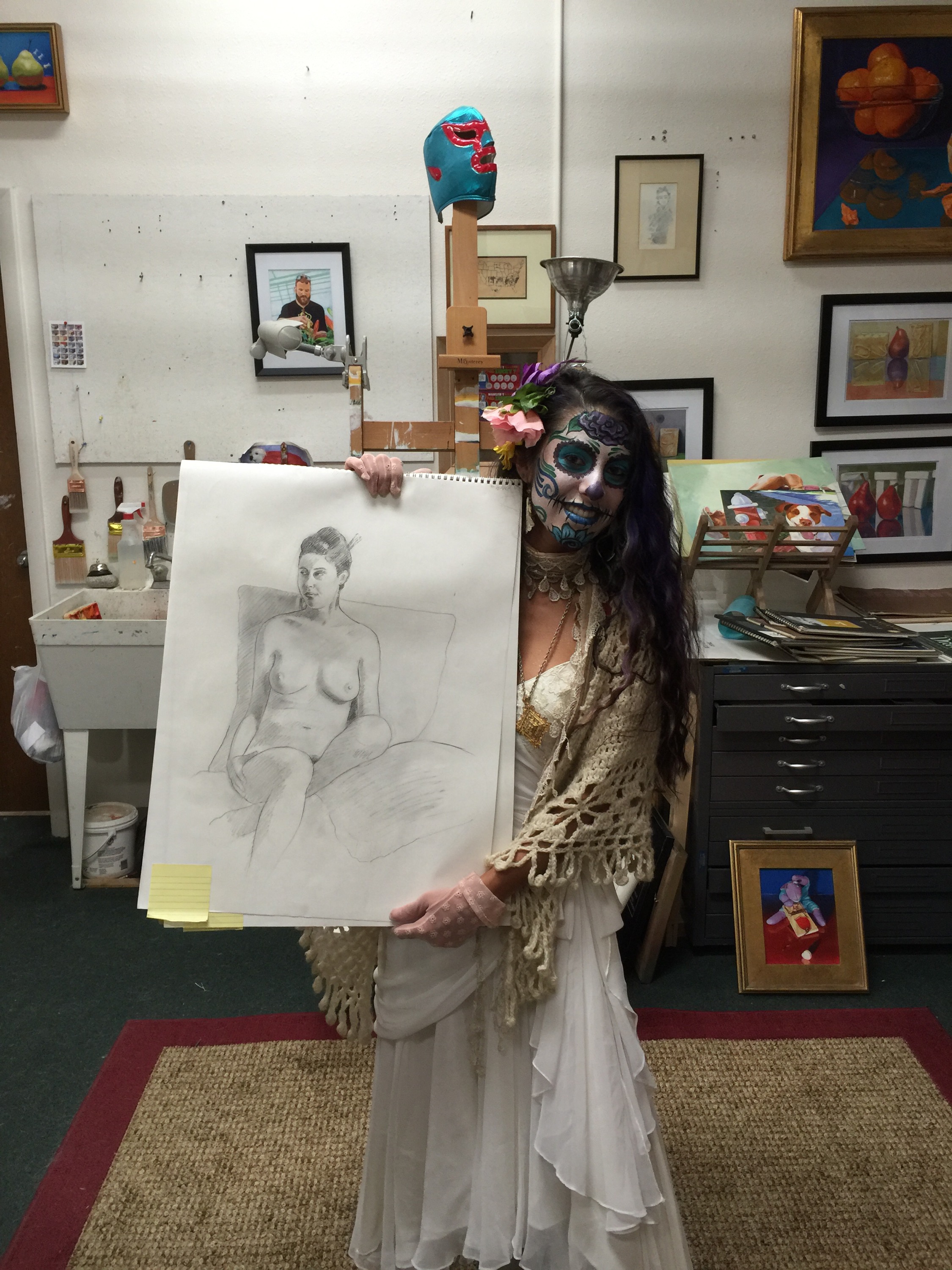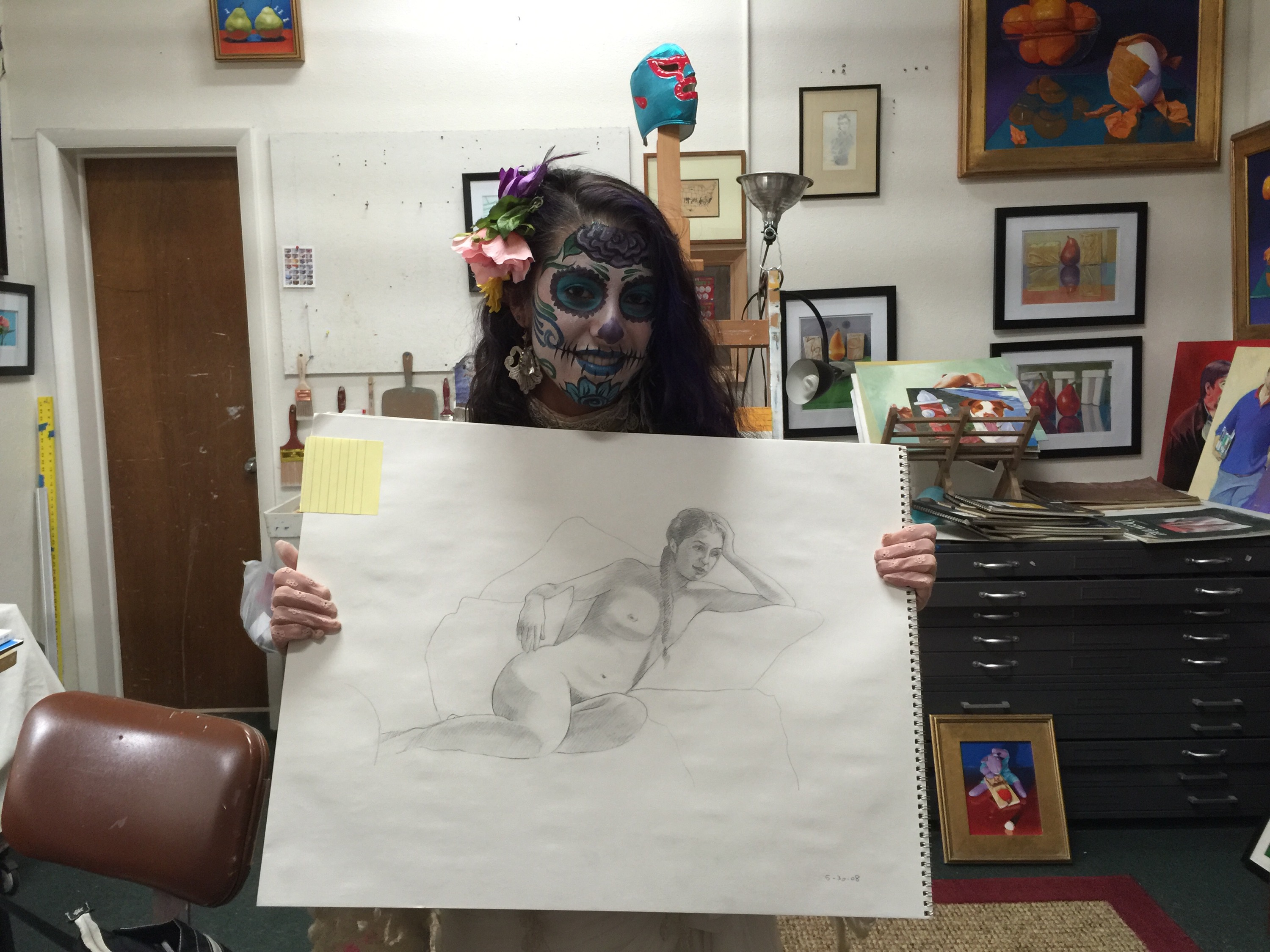 Rheanna is a professional model who has posed for life drawing groups I have attended. Here she is posing with 2 drawings from my sketchbooks.