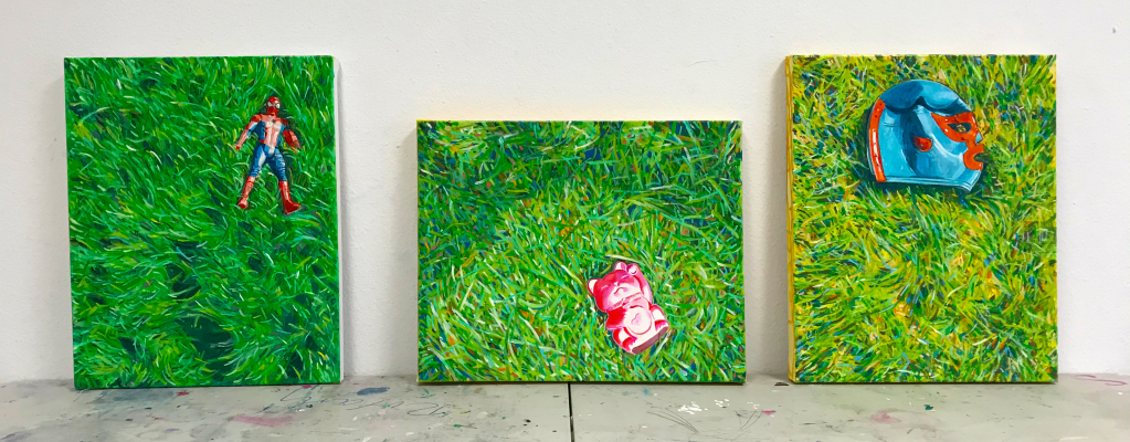 Here are my last 3 paintings (Spider in the Grass, Cat in the Grass & Mask in the Grass) of the decade, lined up.