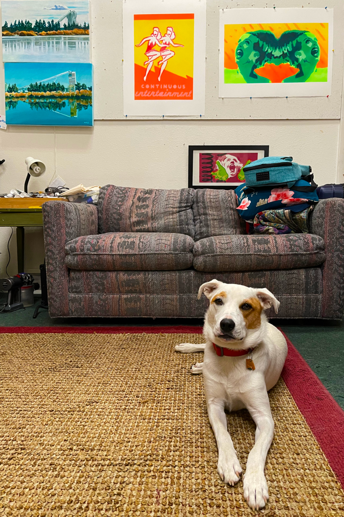 Firehouse Dog My studio in the Firehouse Art Center in Longmont. Gracie is at rest in front of the ugly couch. Some recent work hangs on the wall above. Share this:PostLike Loading... Related